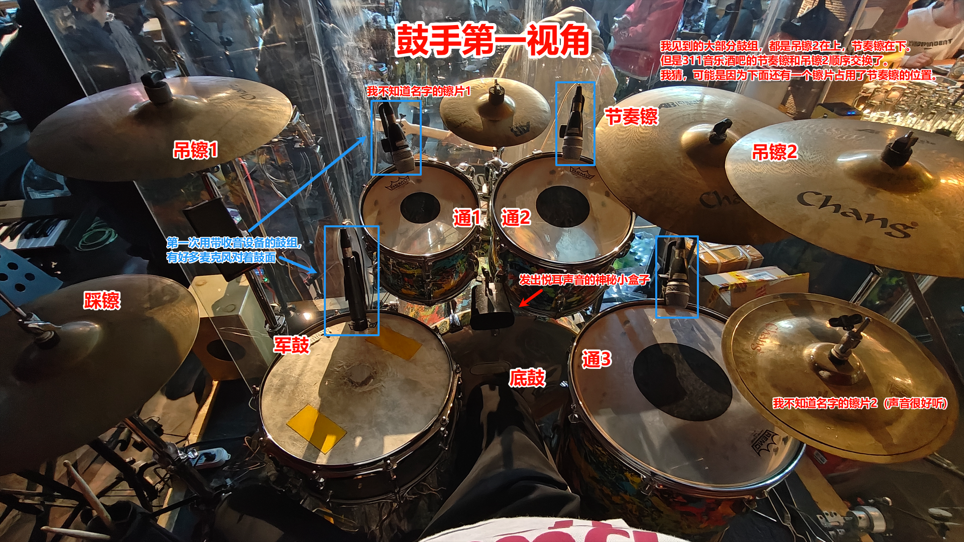 在我们演出的311音乐酒馆里,架子鼓的摆放和国内常见的摆放不同,节奏镲和吊镲2的顺序交换了。